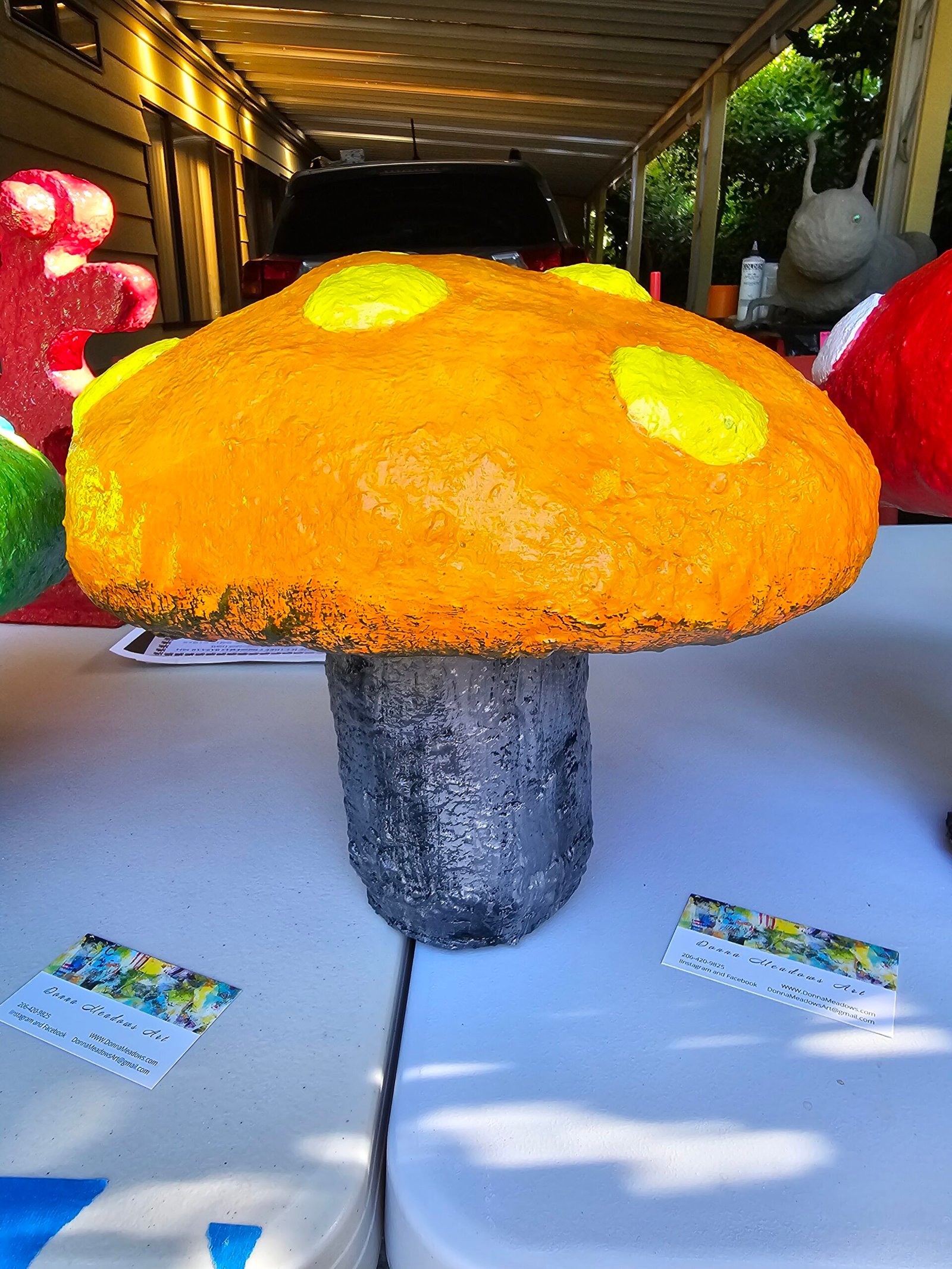 Orange and Yellow Mushroom – 11.5 inches tall x 13 wide. Made with recycled materials and cement paper clay
