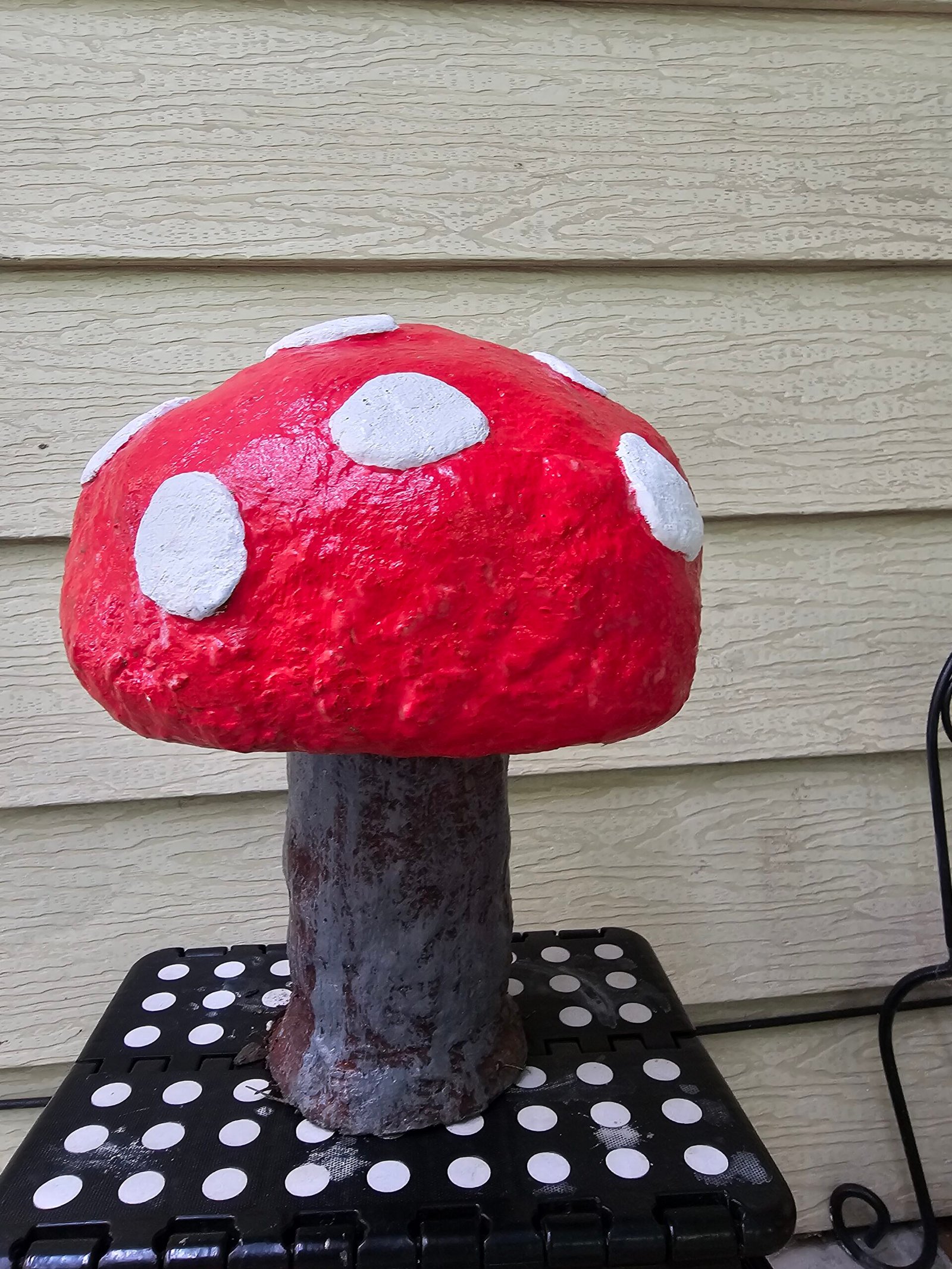 Red and White Mushroom – 13 inches tall x 10.5 wide. Made with recycled materials and cement paper clay